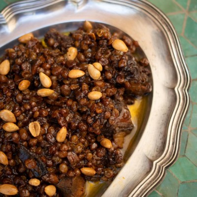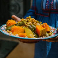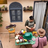 Your four hour cooking class experience at Riad Anata will begin with a trip to the local market. You will wander with your Chef, either Samira or Hassania, through the narrow alleyways of Fes’ ancient Medina to a street lined with produce vendors and butchers. You & your chef will decide what to make (3 courses menu): couscous, tajine, salad, soup, and dessert are all choices you can make as you see what’s on offer at the market. When you arrive back at the riad, you will unload your shopping baskets in the beautiful open-air rooftop kitchen. You’ll start by boiling water for traditional mint tea, which will keep you hydrated and refreshed as you cook your four-course meal. You’ll quickly get to work chopping vegetables for salad, learning how to smoke aubergines on the cooktop for stew, and start slow-cooking a meat dish with a delicious blend of spices including turmeric, cinnamon, cracked pepper, and bright orange saffron.